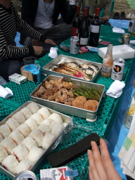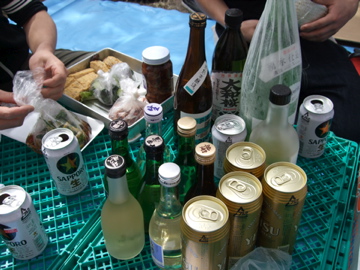 ブルーシートにプラスチックのかごでできたテーブル、宴会仕様です(笑)。