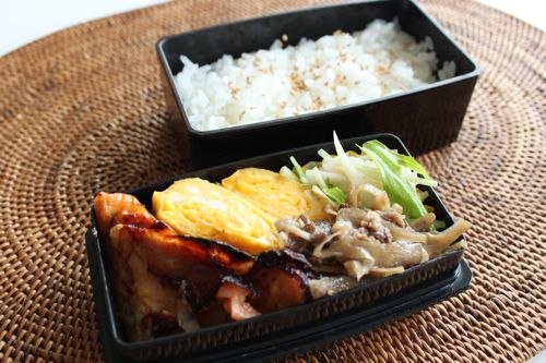 鮭の味噌漬け、大根と帆立のサラダ、卵焼きを詰めて完成です。