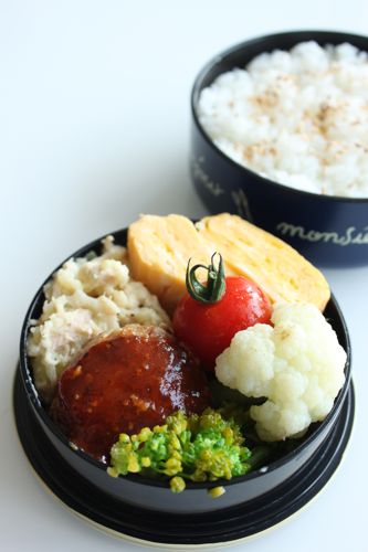 麻婆茄子弁当では「野菜ばっかりだね」と言われてしまったので、今回はどーんと(ってほどではないけど)ハンバーグ弁当にしました。 ミックスグリルを作った時にタネが残ったので、ミニハンバーグにしておいたものなんですけどね。