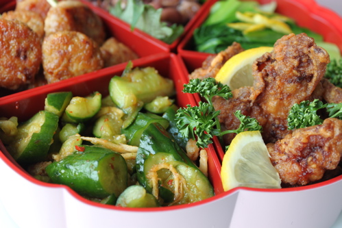 きゅうりの辛み和えと鶏の唐揚げ。レモンやパセリで飾って彩りよく仕上げました。