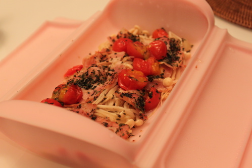 1cm弱の薄切りにしたたまねぎ、ほぐしたえのき、一口大に切ったベーコン、ミニトマトをスチームケースに重ねてならべ、コンソメスープ、白ワイン各少量、塩こしょう、乾燥バジルたっぷりを加えて電子レンジで3分加熱したらできあがり♪
