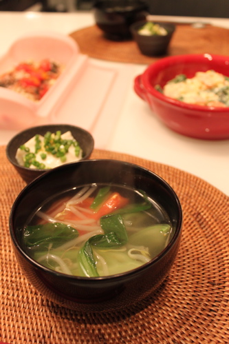 あとは一口サイズの冷奴と青梗菜とトマトのスープ。