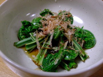 まずはお通し。こごみのお浸しです。かつお節をふりかけていただきます。