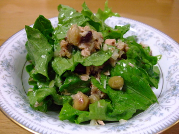 ミックスビーンズ、ツナ缶、たまねぎのみじんぎり、、ちぎったグリーンカールをオリーブオイル、レモン汁、マスタード、塩、黒こしょうで和えたサラダです。