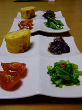 今回は奥から卵焼き、かきのもとのお浸し、ミニトマトのマリネ、かぶ菜炒め、と彩りを考えて作ってみました。