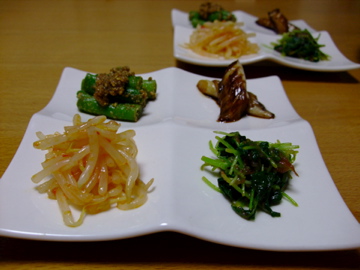 この日は手前からもやしのナムル、三つ葉の梅和え、いんげんのごま和え、焼きねぎ(黒酢で味付け)です。