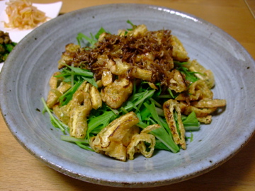 油抜きした油揚げをフライパンでカリカリに焼いて水菜とあわせておきます。