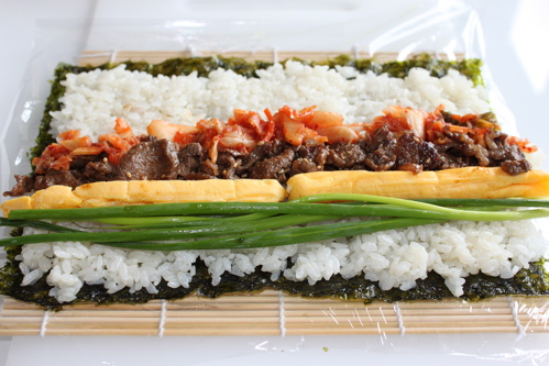 具は何でもいいみたいですけど、私はソウルで食べたキムパムを思い出して、牛肉とキムチの入ったキムパムにしてみました。他には卵焼きとこねぎをチョイス。彩りがいいのは韓国料理の特徴ですよね。牛肉は焼肉のタレで味付けしていりごまをまぶしておきました。
