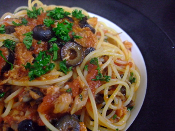 にんにく、ツナ、黒オリーブのスライス、ひらたけしめじ、ホールトマトで。