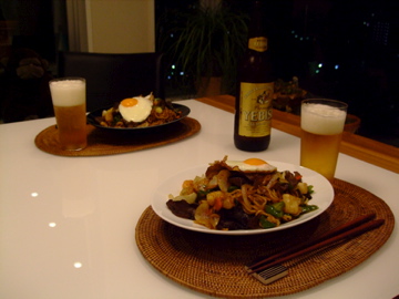というのも、今回は食材が多かったため焼きそばまでたどり着かずに終わってしまったので残り物処理です。前日たくさん食べたこともあり、この日は焼きそばとビールという簡単な晩ごはんになりました。