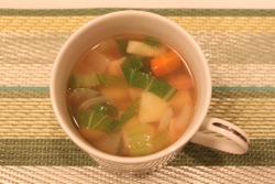 野菜スープは角切りにしたハム、じゃがいも、たまねぎ、にんじん、そしてチンゲン菜をコンソメスープで煮ました。野菜は歯ごたえがしっかり残る程度に。