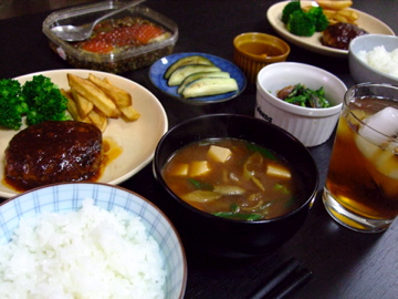 うちはハンバーグを作る時は赤ワインを飲むことが多いのですが、この日はご飯を食べる(お酒をのまない)と決めていたので定食風になりました。