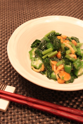 モロヘイヤ1/3束は茹でて1cm幅に切り、オクラ4本もゆでて、5mm幅の輪切りに、なめこ1/2袋はさっと湯通ししてそれらをボウルでよく混ぜてナンプラー小1を加えてさらに和えたらできあがり♪