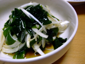 生わかめとたまねぎスライスをポン酢で和えたもの。