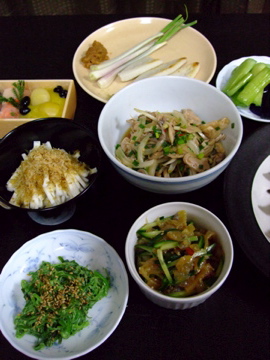 酢もつ、笹かま、漬け物、中華クラゲの和え物、海藻サラダ、長芋のせんぎりを並べました。