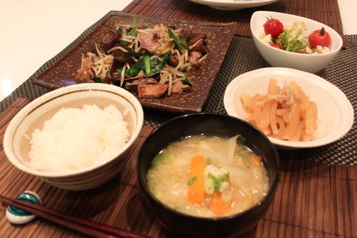 彼がどうしても焼き鳥を食べたかったらしく、モツ(レバー、タン、ハツなど)を買ってきて一人焼き鳥を楽しんだそうです。 その残りのモツが冷蔵庫に残っていたので、この日はモツ炒めになりました。 その前にレバニラ食べたばっかりだったんだけど。