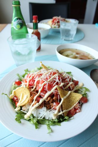 細切りのレタス、ごはん、味付けしたひき肉、トマトとたまねぎ、チーズを順にのせて、トルティーヤチップスとマヨネーズを飾りました。全体をよーくかきまぜていただきました。