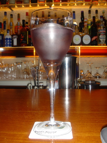 クランベリージュースの赤とブルーキュラソーの青を使ってこの美しい色を出すのだとか。