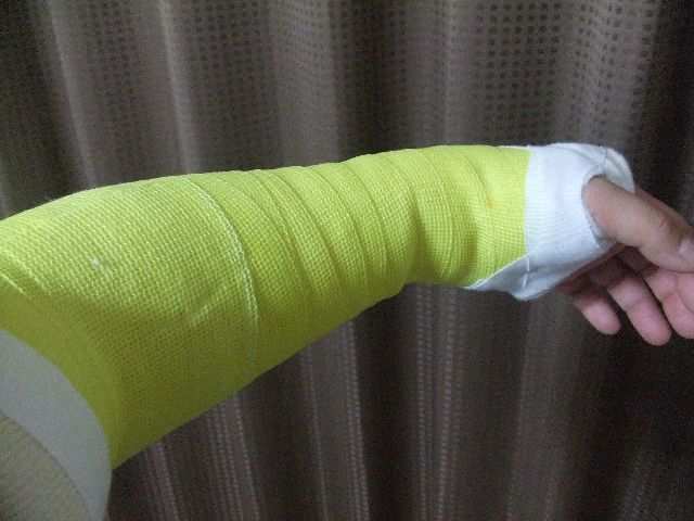 肘上から手首までガッチリ固定され、全治3週間だそうです。とほほ…。