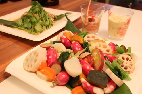 華やかな盛りつけ!さすがプロですよね〜。バーニャカウダソースと柚子コショウのソースがついていました。