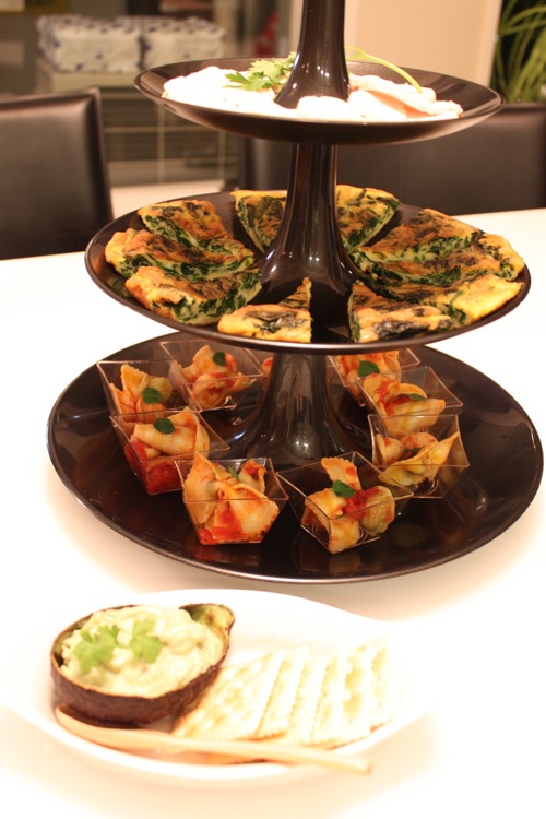 アボカドのディップはクリームチーズとアボカド、レモン汁をビニール袋に入れて全体をつぶして、かに缶を加えてできあがりです。アボカドの皮に入れてクラッカーを一緒に並べました。
