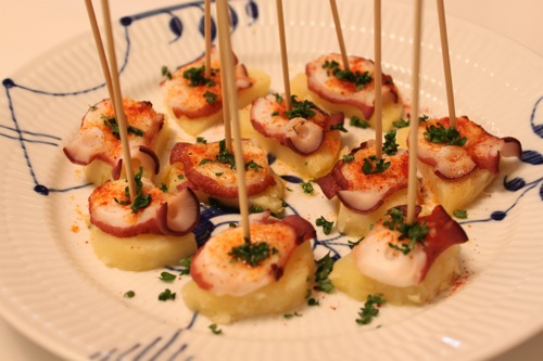 たこのガリシア風。ゆでてスライスしたじゃがいものうえに塩とローリエで茹でてスライスしたたこをのせ、パプリカ、チリペッパー、塩、オリーブオイル、パセリをかけ、食べやすいようにようじを刺しました。子供用にはジャックオーランタンのピックを使いました。