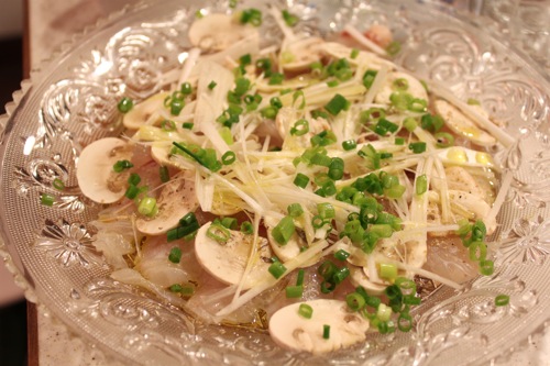 カルパッチョは平目です。薄く切ってお皿に並べた平目の上にスライスしたマッシュルーム、白髪ねぎ、こねぎ、塩、レモン汁、オリーブオイルをかけてできあがり♪