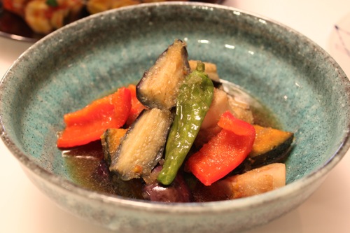 これは野菜の揚げ浸し。かぼちゃ、なす、パプリカ、ししとう、れんこんを素揚げして(一部片栗粉にまぶして揚げました)、うすめためんつゆにすりおろしたたまねぎをたっぷり加えたものにダイブさせておくだけです。簡単なのに美味しいのでお気に入りの1品。