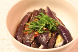 蒸して冷やしたなすにピリ辛のタレをかけた涼拌茄子は何度でも作りたくなるほめられレシピの馬場香織さんのレシピです。そう、私のバイブルの。