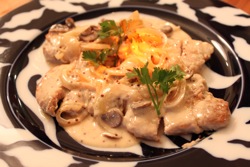 小麦粉をつけて焼いた豚ロース肉をたまねぎとマッシュルームをバターで炒めたお鍋に入れて、生クリーム、粒マスタード、塩で味付けして少し煮込みました。マスタードの酸味がほんのり効いていて、それでいて生クリームのまろやかさがあり、大変美味しくできたと思います。これは大人の女性に好評だったかな。残ったものを実家に持って行ったら家族にも好評でした。