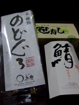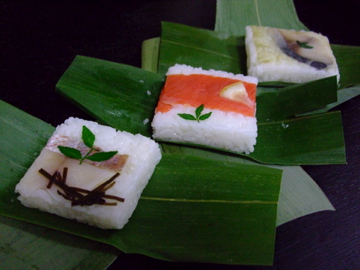左は舟楽さんののどぐろの棒鮨、奥が芝寿しさんの笹寿し、右は同じく鯖の棒寿しです。