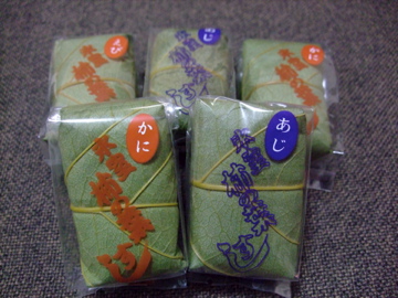 鰺とかに。柿の葉寿司は一口サイズで種類も色々ありました。