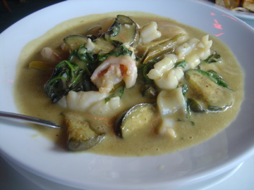 グリーンカレーです。ココナッツの甘みがきいていて、とてもマイルドな味でした。ライスと一緒に。