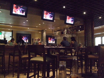 スポーツバーらしく、スポーツ中継(この時はアメフト)を映すモニターがたくさんディスプレイされています。