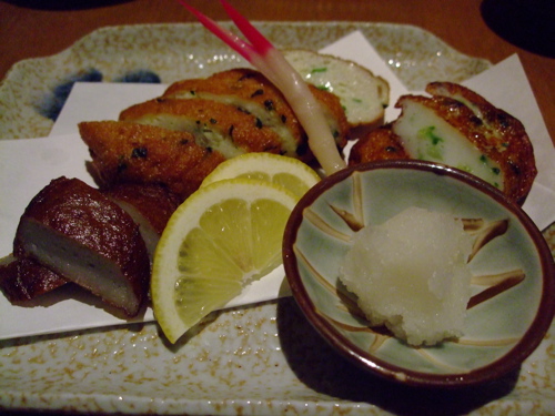で、やっぱり鹿児島といえばさつま揚げですね。左がじゃこ、右がゴーヤのさつま揚げだそうです、真ん中は忘れてしまいましたが、具だけでなく使っているお魚も違うようで3つとも食感や香り、味が違っていました。