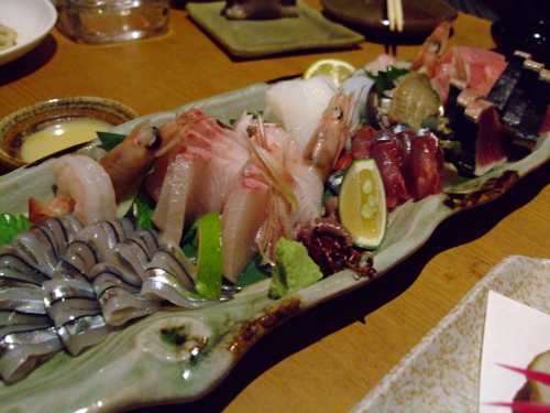 「新潟から来たので鹿児島らしいお料理を出してください」とお願いしたところ、すごい盛りのお刺身が登場しました。こ、これ、3人で食べる量ですか???(笑)