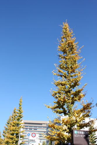 青々とした空に黄色に色づいた木がとても綺麗でした。