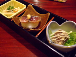 左上はお通し。左からマカロニサラダ、しめ鯖のにぎり、まぐろの竜田揚げ。