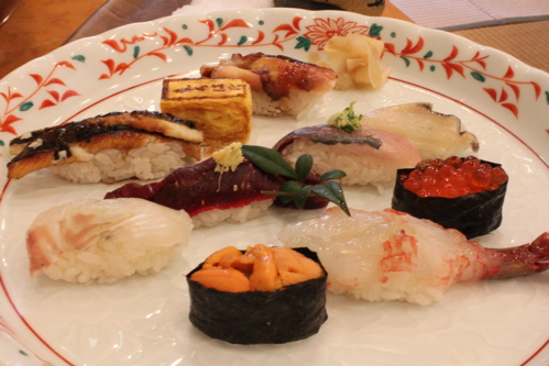 ネタはその日によって違うと思いますが、この日は手前からうに、車海老、いくら、白身(弾力があったのでコチに近いと思いますが、何かわかりませんでした)、鯨、鰺、アワビ、穴子、卵、蛸(煮蛸)。そしてまぐろのヅケ、中トロ、大トロです。これで3800円ですから安いですよね。