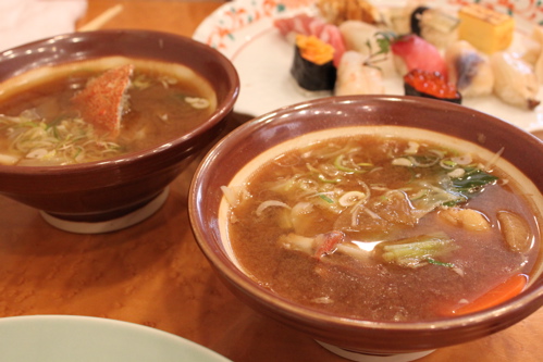 毛蟹のお味噌汁(左)とメヌケのお味噌汁(右)。