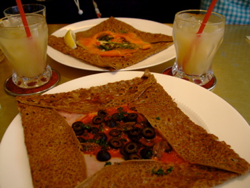 私はチーズ・ハム・トマトソース・アンチョビー・オリーブのガレット、妹はチーズ・スモークサーモン・トマト・マッシュルームのガレットです。どちらも端までしっかり具が詰まっていて、かなりのボリュームでした。ガレットというのはそば粉を使ったクレープのことですが、食べた印象はフランス版ピザのような感じでした。