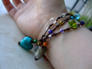 ガラス玉がいくつもヒモに通してあって、1本になっているのですが、首にまけばネックレスになるし(ハートのガラスの重さでくるっとまわすだけでネックレスになるんです。これがすごいと思いました)、こうやってブレスレットにもなります。こういうちょっとしたアクセントってオシャレには大事ですよね☆