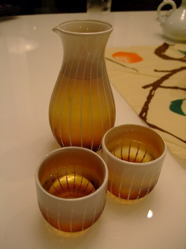 色は他にグリーンとパープルがあって(下の写真に写っていますね)、どちらも独特の色あいのモダンで素敵な食器でしたが、日本酒は冷やでいただくことが多いわが家にはこの色がいいかな、と一番すっきりした色のものを選びました。もちろん耐熱なので嫺もできます。帰って早速日本酒をいただきましたが、気に入ったもので飲むとお酒もより美味しく感じますね。