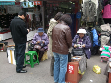 南大門市場の道端に鞄をさげたおばちゃんがちょこんと座っているんです。
