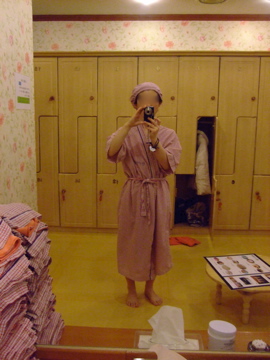 ロッカーで裸に綿のガウンと帽子を身につけ、まず黄土サウナという漢方の香りのするサウナ室でしばらく寝転んで体を温めました。10分か15分くらいでしょうか、かなり体がポカポカしてきました。