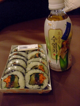 最終日の朝遅くにサムゲタンを食べていたので、キンパッはもう食べられないかなと思っていたのですが、おみやげ用に冷凍保存しておいてもらったケジャンを取りにロッテデパートの地下に行ったついでにひとつ購入してみました。